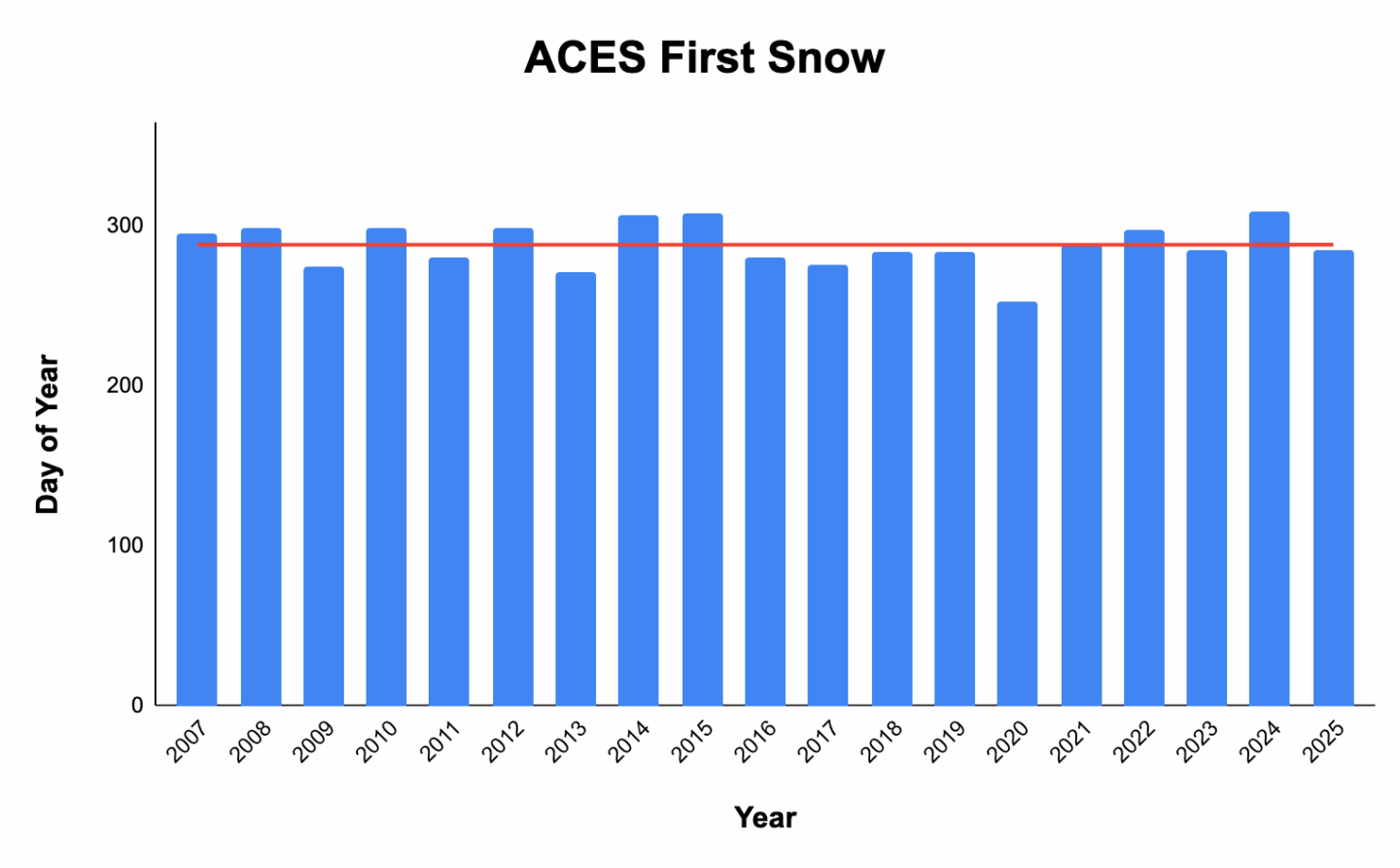 Sunday, October 12th, marked the first snowfall in Aspen, according to ACES snowpool rules. Since 2007, when ACES began keeping track, the first snow in town has been as early as September 9th (2020) and as late as November 4th (2015 and 2024). This year’s October 12th snow is smack-dab in the middle, falling just three days before the 10 year average.