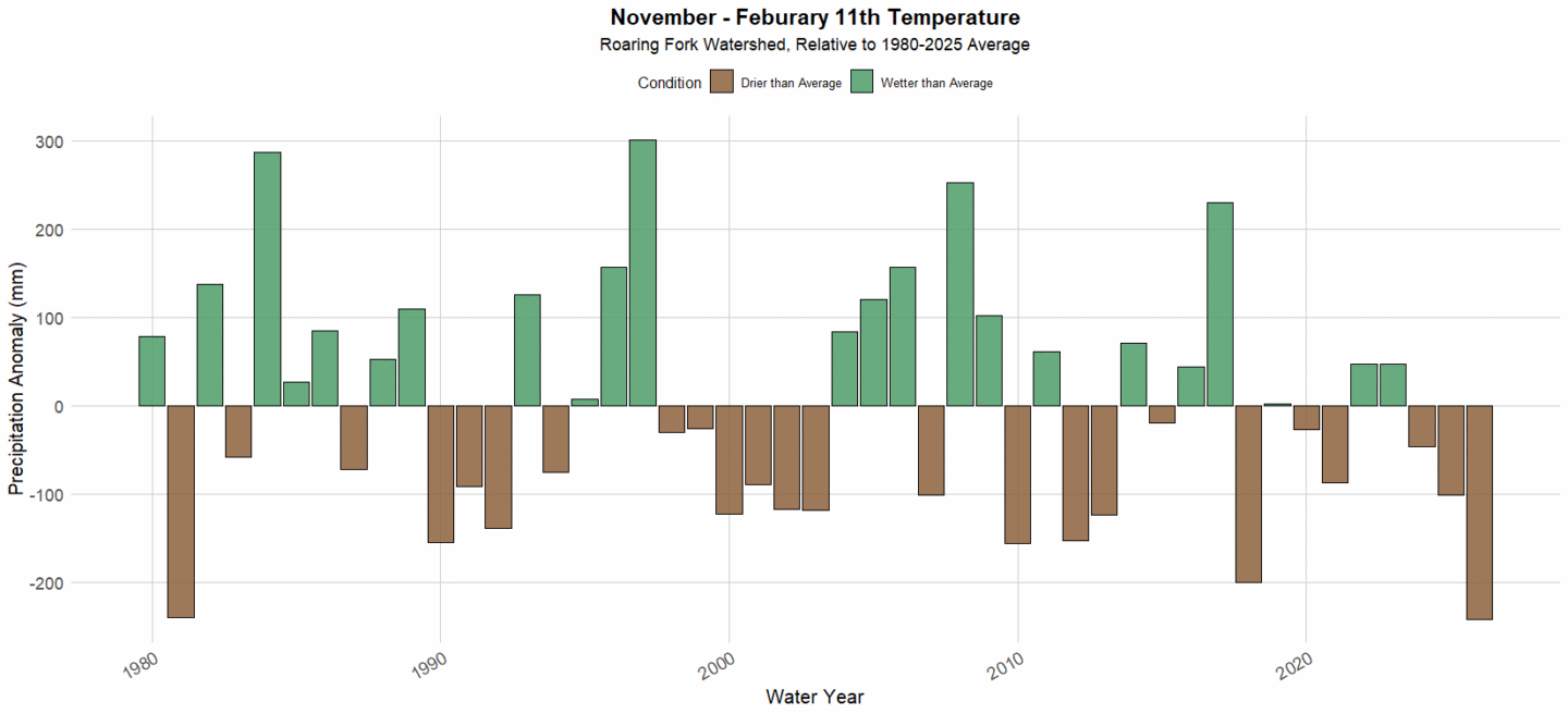 To understand the severity, we analyzed the period from November 1st to May 31st. We selected this period as the time when mountains in the Roaring Fork Watershed are typically receiving snow. While snowpack is almost always declining in May (with a few notable exceptions), a wetter and colder May can significantly slow down that decline and prolong the period in which snowmelt is feeding local ecosystems and rivers.