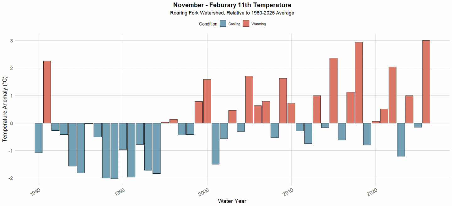 What’s different about these two years is that 1981 was an anomaly—it was at the start of a decade with cooler temps and mostly above-average precipitation. On the other hand, 2018 and 2026 are both part of consistently hotter-than-average winters and, more recently, drier starts to the season.